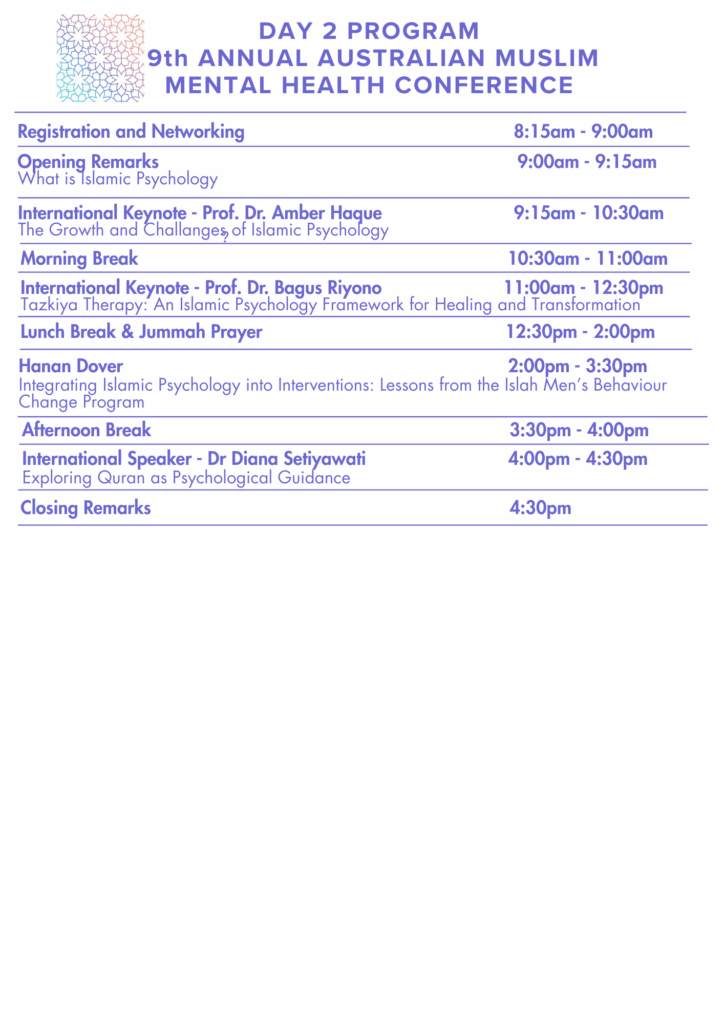 The second day shifts towards revival and restoration, highlighting the global growth of Islamic Psychology and the renewed commitment to re-grounding the discipline in its authentic intellectual and spiritual traditions. Sessions will cover:
