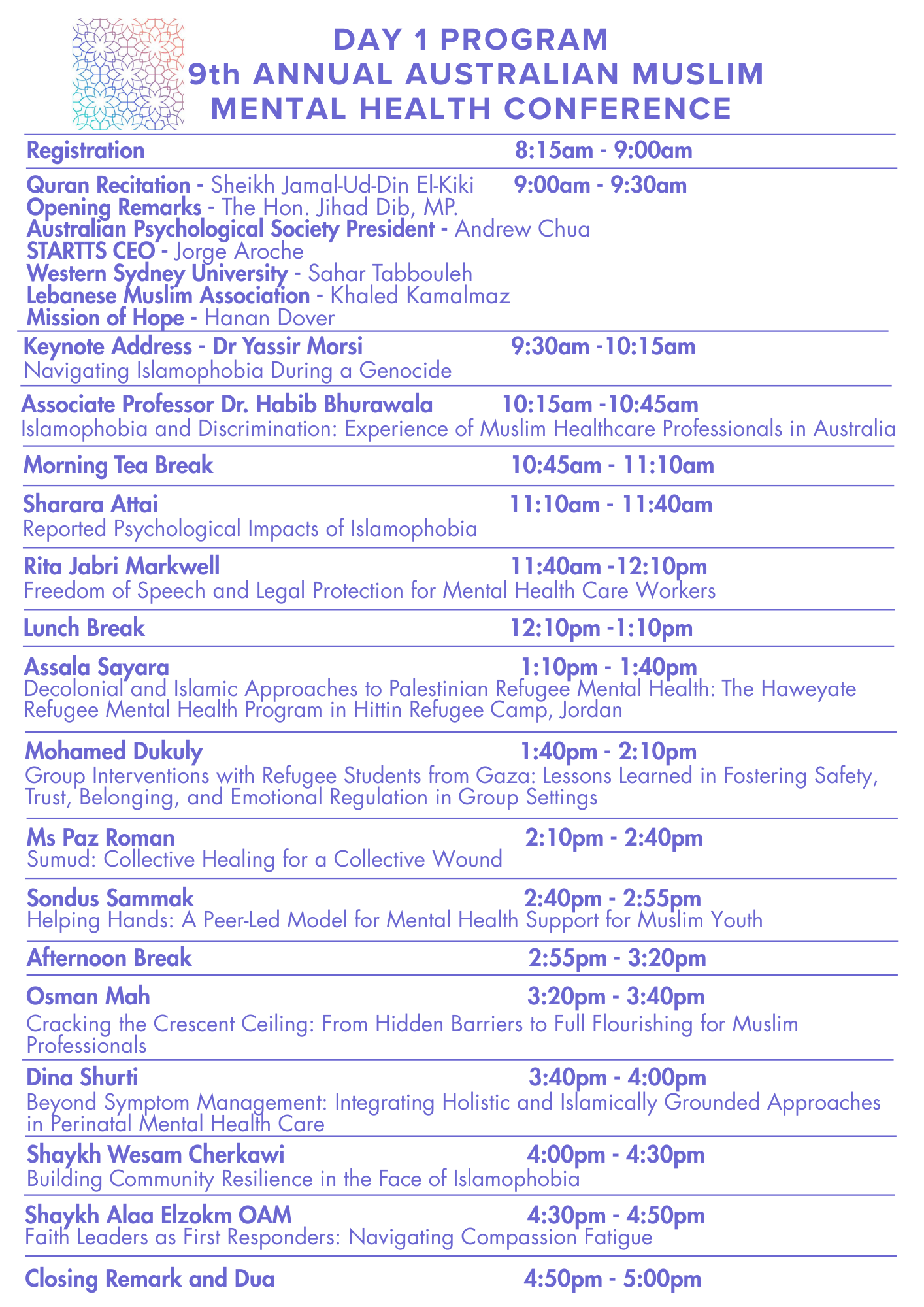 The first day of the conference centres on the urgent need to understand and respond to the psychological and social consequences of Islamophobia. Through trauma-informed, faith-aligned, and anti-oppressive approaches, sessions will explore: